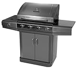The Char-Broil N480 four-burner grill features an enclosed, appliance style, two-door, cart design and a great step up in the Char-Broil lineup.The grill is powered by four stainless steel tube burners running front to back and pushing 48,000 BTUs to heat a comfortably large 480 square inches of primary cooking area that is complimented by an additional 208 square inches of secondary cooking space.The side shelf reveals a 13,000 BTU flush mounted side burner and all of the burners are fired by an easy push of the button with electronic ignition.The stainless steel look is accomplished through a blend of stainless steel and painted steel and the cart itself has casters that can lock the grill into place.This heavy duty grill has the look and value to really make grilling fun.