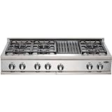 This DCS Stainless Steel Professional Cooktop features (6) 17,500 BTU patented Dual Flow sealed gas burners and 18,000 BTU gas grill. The DCS Cooktop patented Dual Flow Burners go from simmer to boil at a range of 140 degrees to 17,500 BTUs. DCS Cooktop Dimensions (in inches): 47 7/8 W x 8 7/16 H x 26 1/2 D and fueled by natural gas.