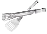 Use Weber's versatile spatula and tongs set for flipping, handling, plating and serving food cooked on your Weber Q grill. Both dishwasher-safe tools are made from durable 304-grade stainless steel and snap easily under the Weber Q's built-in tool bar for instant access and storage. Long handles keep your hands at a safe distance from the heat. A perfect accessory for any charcoal or gas grill, the set is compatible with Weber's Q 120, Q 200, Q 220, and Q 300 gas grills.
